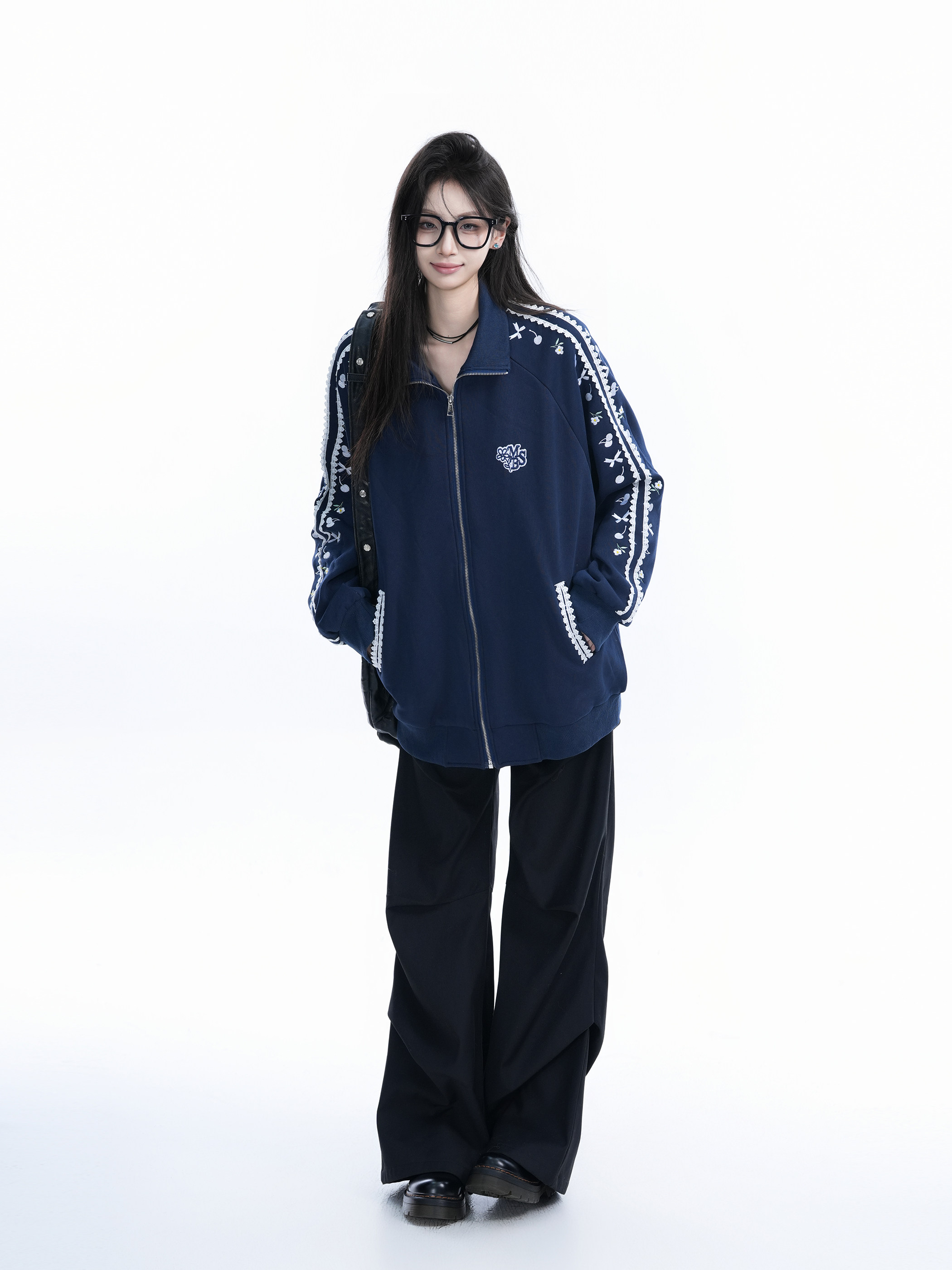 American-Style Letter Embroidered Stand-Up Collar Jacket for Women 2025 New Zipper Cardigan Loose Casual Jacket