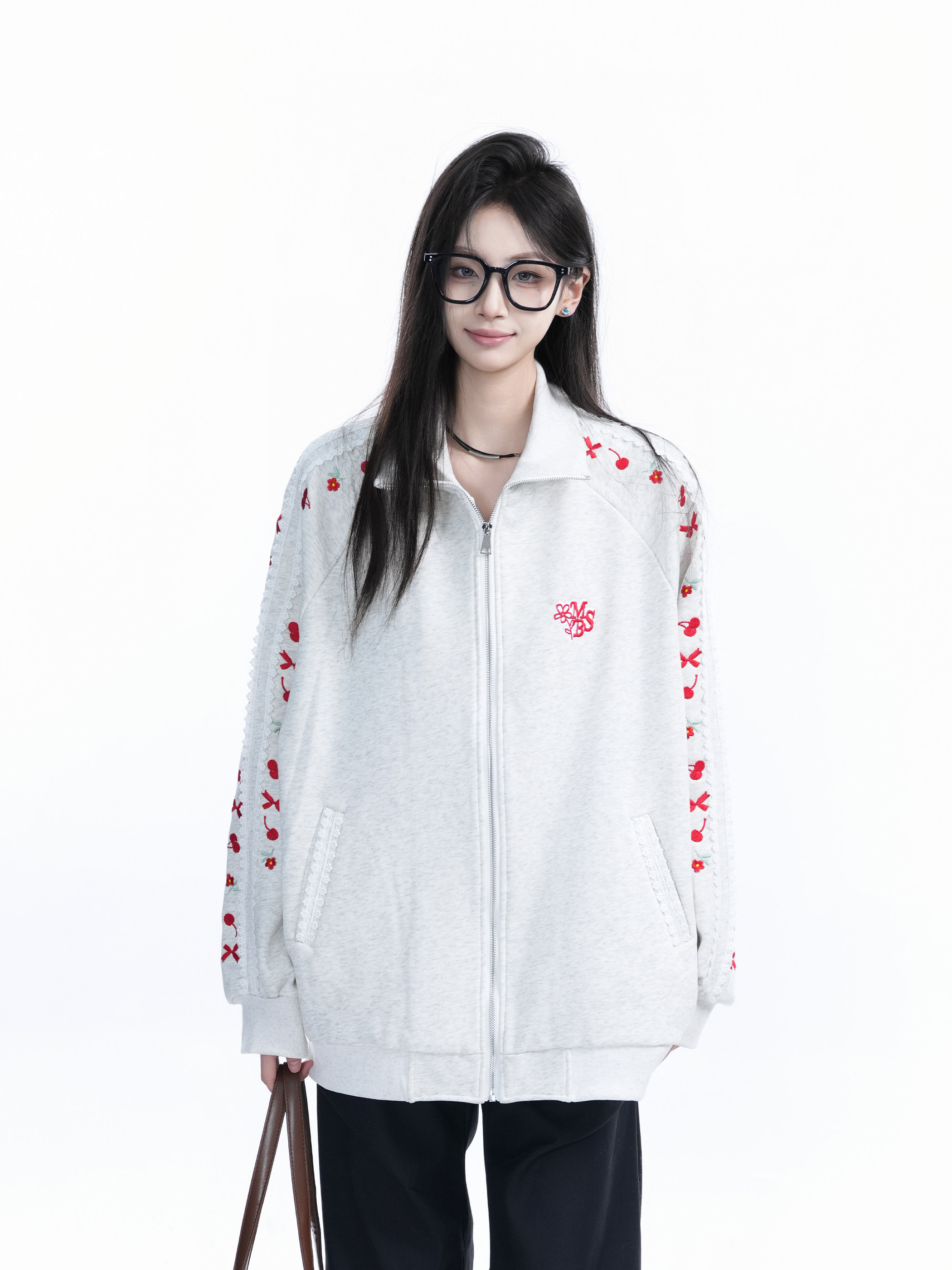 American Retro Cherry Bow Embroidered Cardigan Sweatshirt for Women, Fleece-Lined, Loose-Fitting Zip-Up Jacket