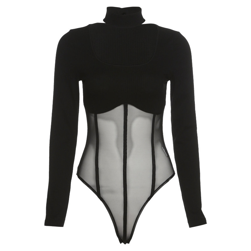 Hot Girl Mesh Fishbone Splicing Knitted Jumpsuit Female Sexy Pure Color Sexy Bottoming T-Shirt Trbottomy